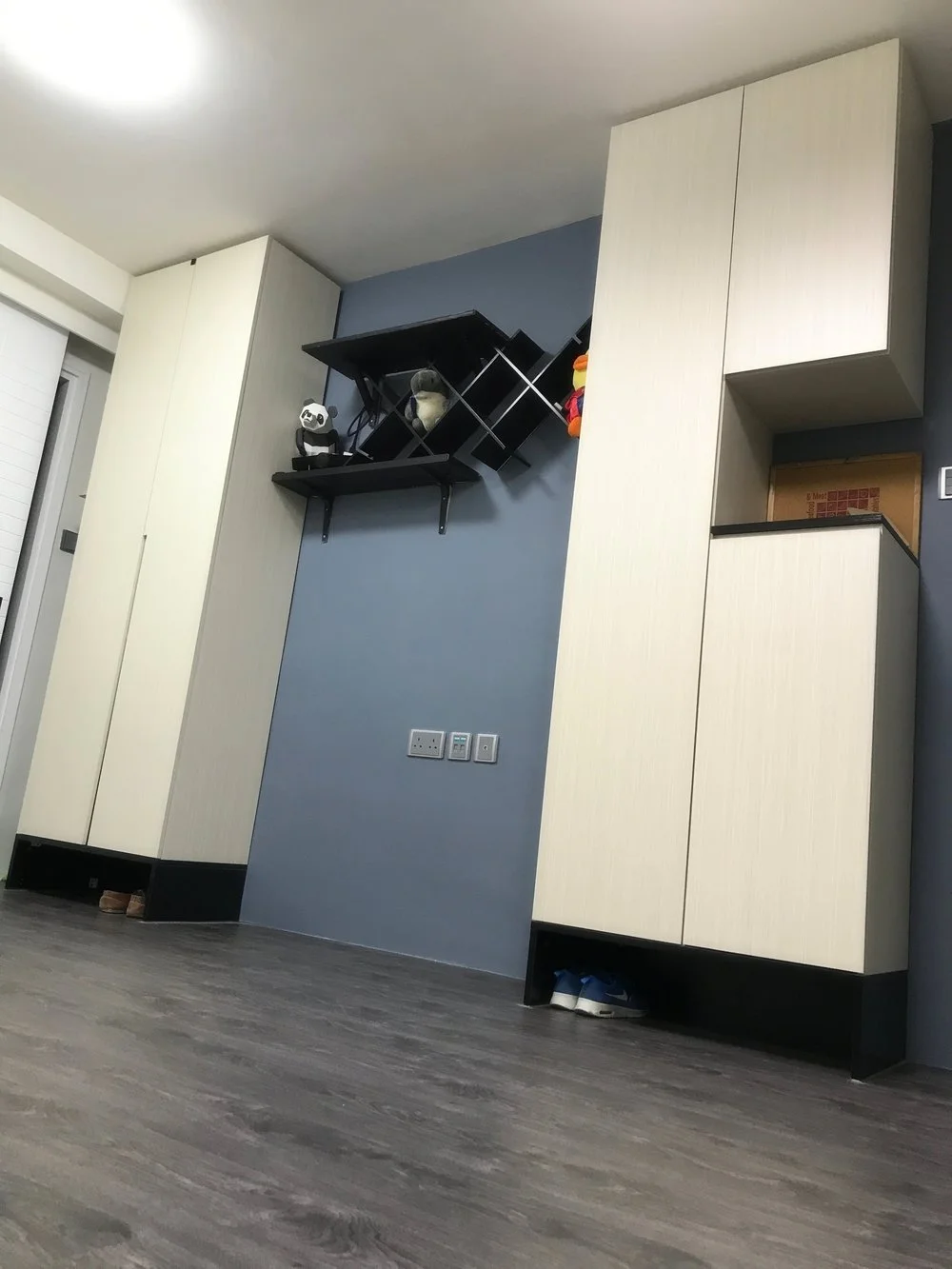 In order to maximize the usable spaces which were originally hidden, the designer decided to tear down the entrance wall of one room and at the same time move the entrance of the other room to the side. The perimeter of the living room is compiled of multi-functional cabinets, with a movable study table that can be extended to a large gathering table when needed. In the bedroom, the designer elevated the bed to increase storage space and fitted in a clothes-hanging area.